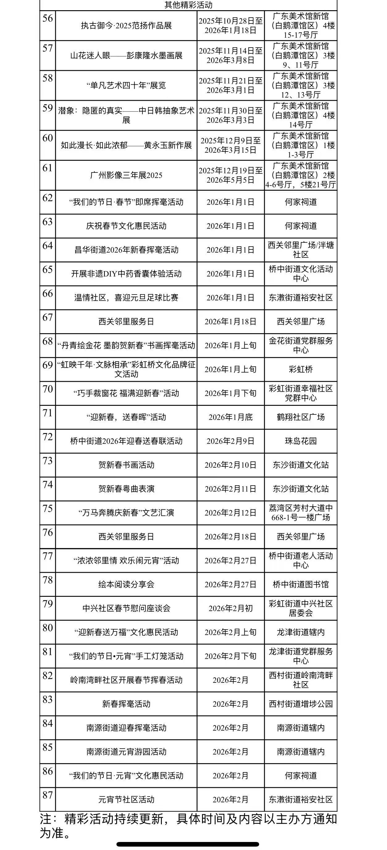荔韵润万家,文化暖人心。荔湾区将推出覆盖全区的“荔韵新春”文化惠民系列活动,包括全民艺术普及联盟公益课程、“客风汉韵 古乐和鸣”新年惠民展演、“荔音粤韵 声声不息”粤语合唱朗诵音乐会、“书香贺岁·荔享阅读”系列阅读推广活动等,将文化服务送到群众家门口,丰富市民群众节日文化生活。