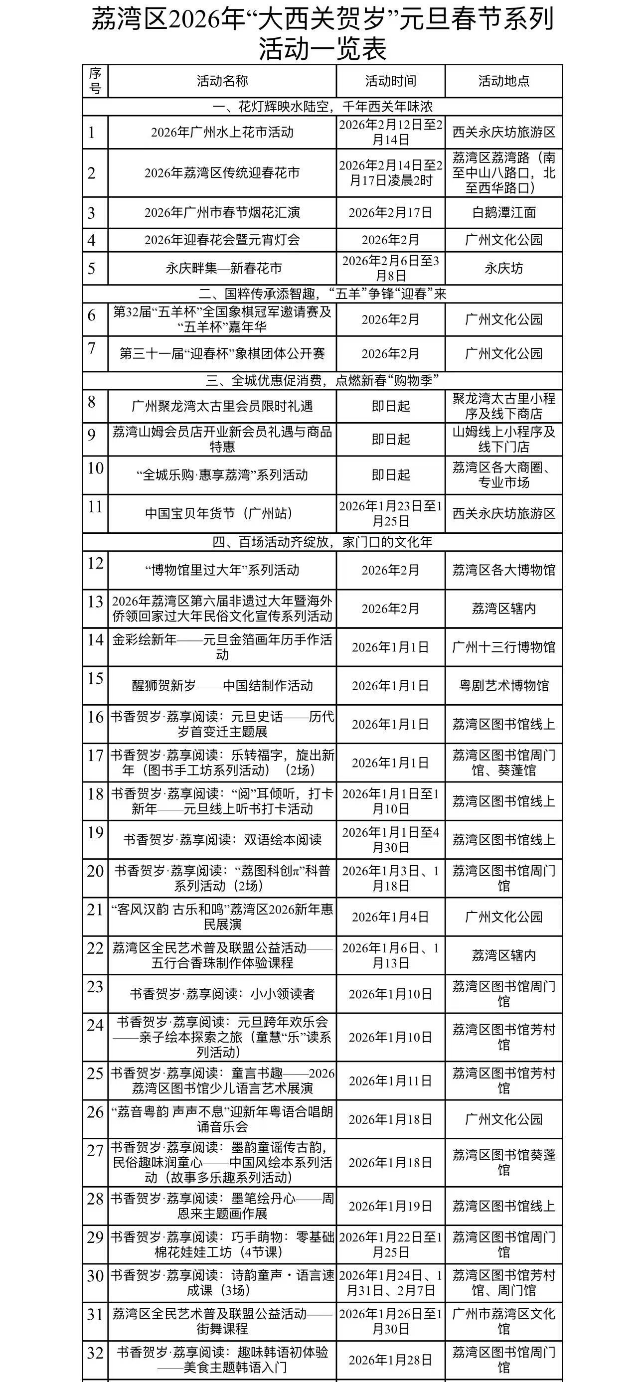 岁序更替,华章日新。2026年元旦春节将至,荔湾区以“大西关贺岁”为主题,精心筹备了一系列年味浓郁、形式多样、覆盖广泛的文商旅体活动。