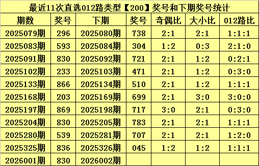 上期回顾:体彩排列三第2026001期开出奖号:830,其012路比为2:0:1,奖号012路类型为:200。