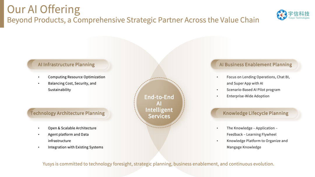 在全球市场的开拓中,单纯的技术输出已不足以构建长期的竞争优势。面对不同市场多元化的金融生态和个性化的客户需求,宇信科技的核心优势之一,来自于我们对金融业务的深度理解,以及将AI技术转化为成熟产品的能力,这更是全球金融数字化转型的必然趋势。宇信科技已将AI能力全面融入产品能力、经营赋能、技术架构、知识更新等多个层面,通过技术革新与生态合作,助力全球金融机构提升数智化水平。