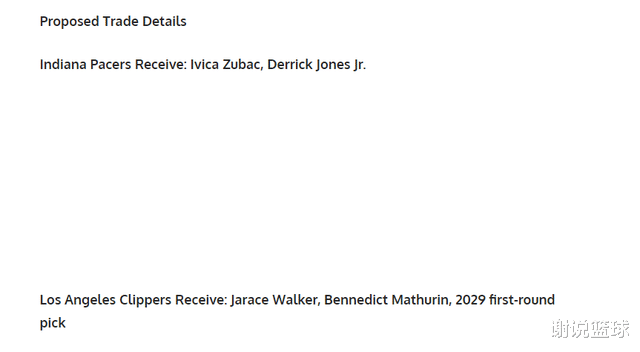 媒体FW就脑洞大开,支招快船跟步行者进行交易,可以兜售中锋祖巴茨再加上扣将小德里克-琼斯。而从具体方案来看,快船换取两名替补贾里斯-沃克、马瑟林再加上一个2029年的首轮选秀签位。